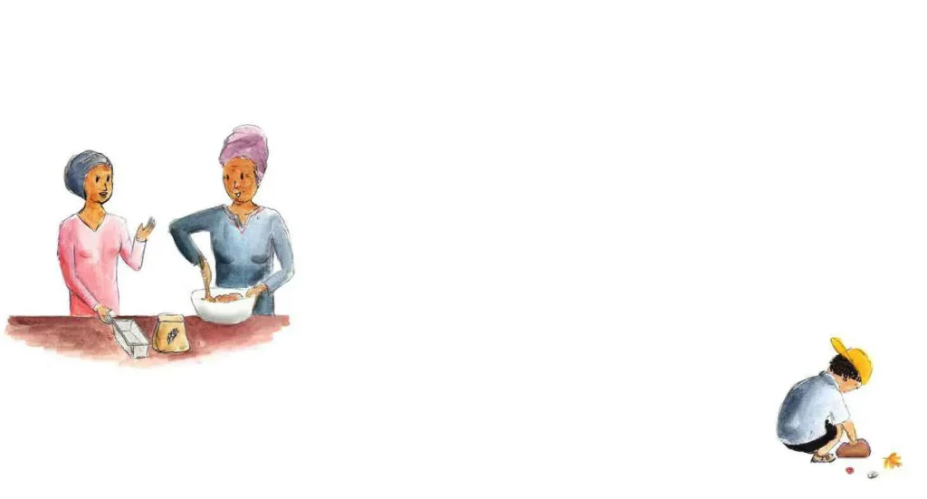 بَيْنَمَا كَانَتْ الْعَمَّةُ جَمِيلَةُ تَطْهُو الطَّعَامَ لِلْمُسَافِرِينَ الْجَائِعِينَ، انْشَغَلَ مَاجِدٌ فِي البِنَاءِ.
