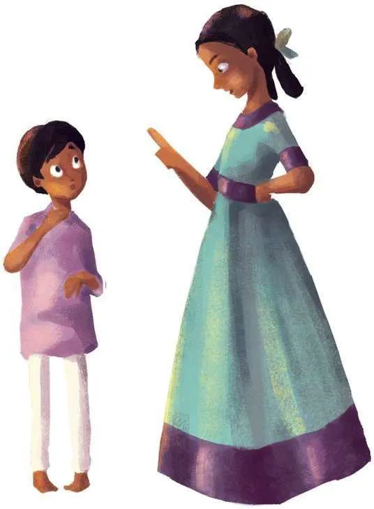 قَالَ صَوْتٌ صَغِيرْ مُتَذَمِرَ: أُمِّي! لَمْ تَطْلُبِي مِنِّي أَبَدًا الْمُسَاعَدَةَ! وَأَنَا جَائِعُ. قَالَتْ الأَمُّ بِلُطْفٍ: يُمْكِنُكَ مُسَاعَدَةُ أَخْتِكَ الْكُبْرَى يَا دُودُو، جُوجُو! خُذِيهِ مَعَكِ مِنْ فَضْلِكِ.