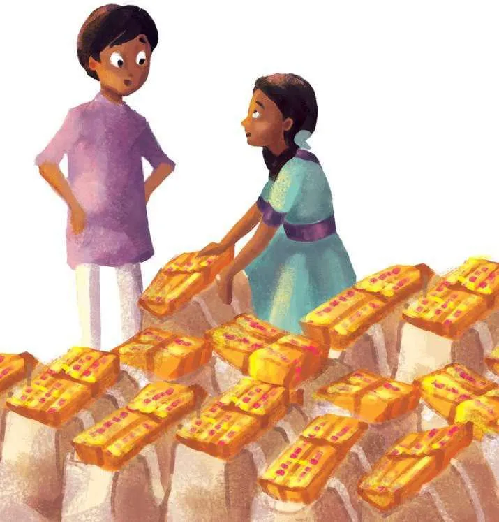 قَلِقَ آدَمُ جِدًّا وَفَكَّرَ : سَيَسْتَغْرِقُ تَفْرِيغُ كُلِّ الْحَقَائبِ وَحِسَابُ مِئَةٍ صُنْدُوقٍ وَقْتَا طَوِيلًا جِدًّا يَا أُخْتِي! وَأَنَا جَائِعُ جِدًّا.