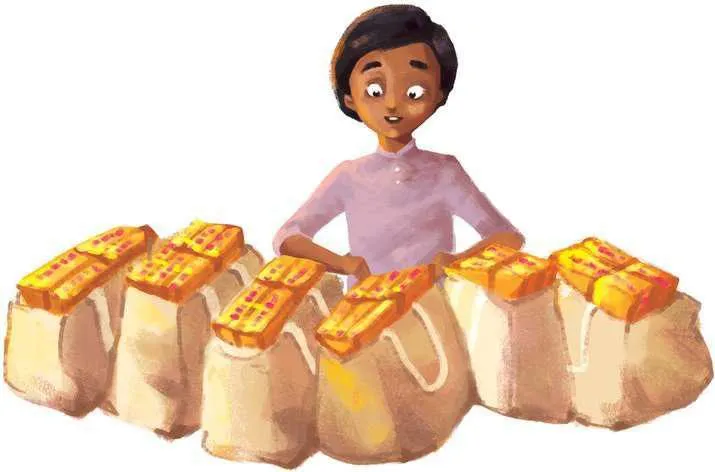 هَزَّ آدَمُ كَتِفَيْهِ قَالَتْ أَرِيحُ: إِنَّهُ يَعْنِي أَنَّ كُلَّ حَقِيبَةٍ تَحْتَوِي، تَقْرِيبًا، عَلَى أَكْثَرَ أَوْ أَقَلَّ مِنْ عَشْرَةِ صَنَادِيقَ مِنَ الحَلْوَى !