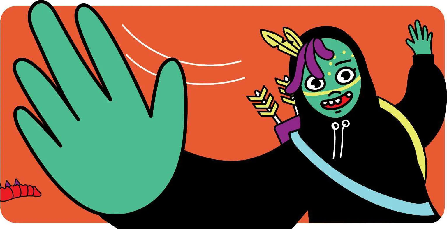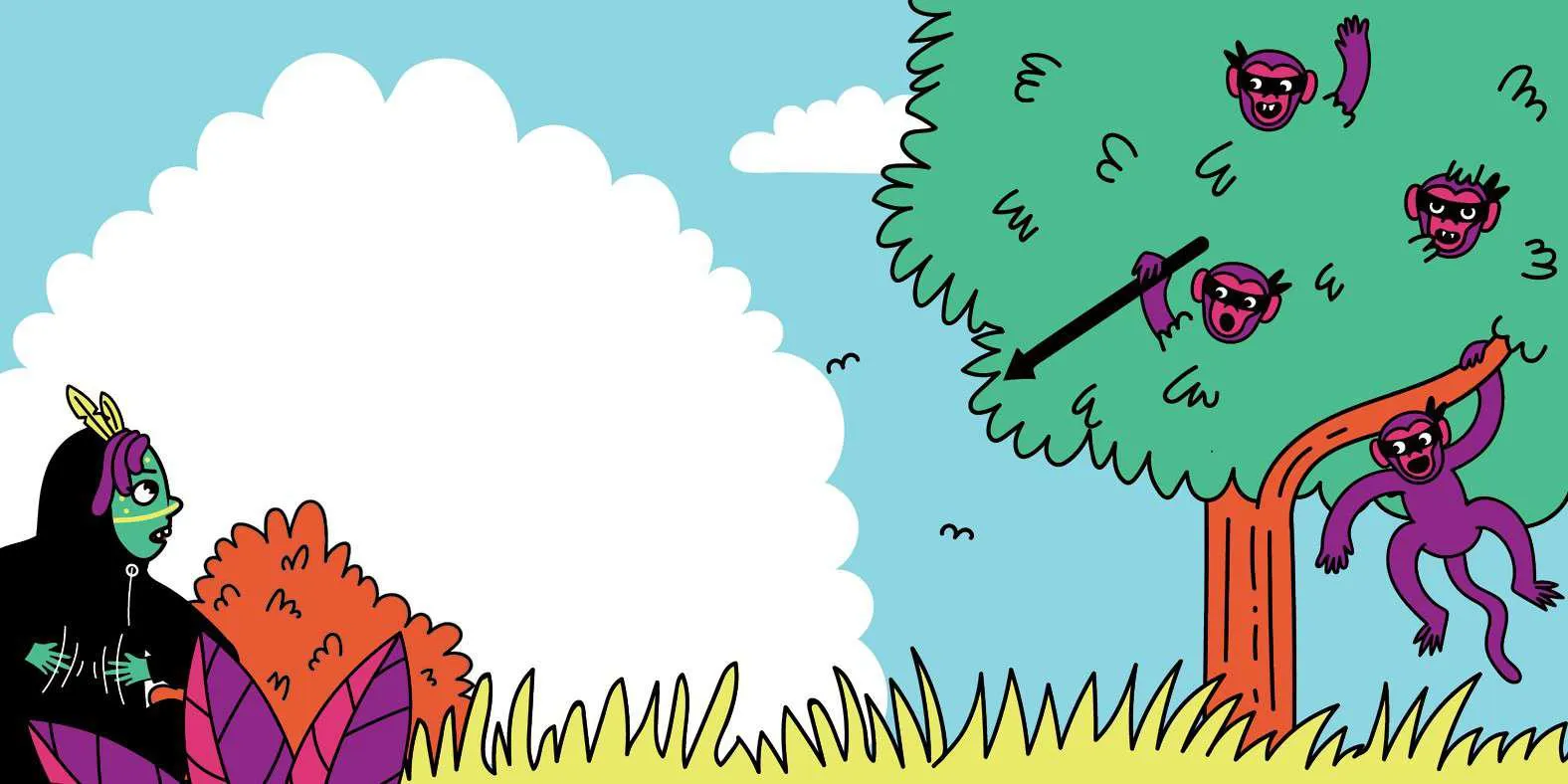 هَل تَرَى قُرُودَ النِّينْجَا أَعْلَى الشَجَرَةِ؟ أُرِيدُكَ أنْ تَهُزَّ الكِتَابَ الذِي بَيْنَ يَدَيْكَ حَتَّى تَسْقُطَ القِرَدَةُ جَمِيعُهَا عَنِ الشَّجَرَةِ. هُزَّ بِقُوَّةٍ، هُزَّ بِقُوَّةٍ، هُزَّ بِقُوَّةٍ، هُزَّ بِقُوَّةٍ.