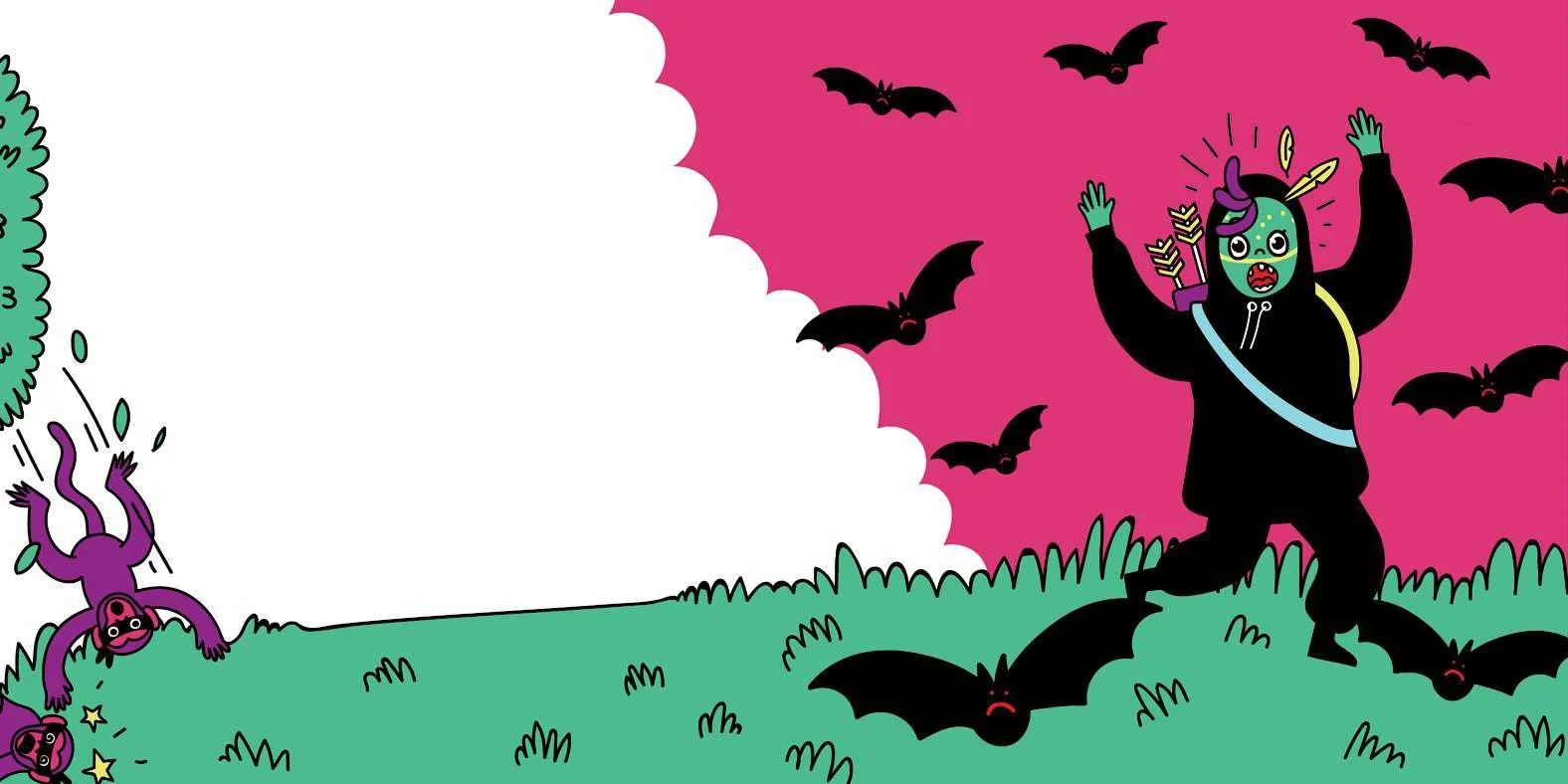 أُوْه، لَا! تُوْجَدُ خَفَافِيشُ! أُريدُكَ أَنْ تَطْرُدَهَمْ بِأَنْ تَنْفُخَ عَلَى الصَفْحَةِ! وَاحِدْ، اثْنَانْ، ثَلَاثَةْ – أُنْفُخْ بِقُوَّةٍ!