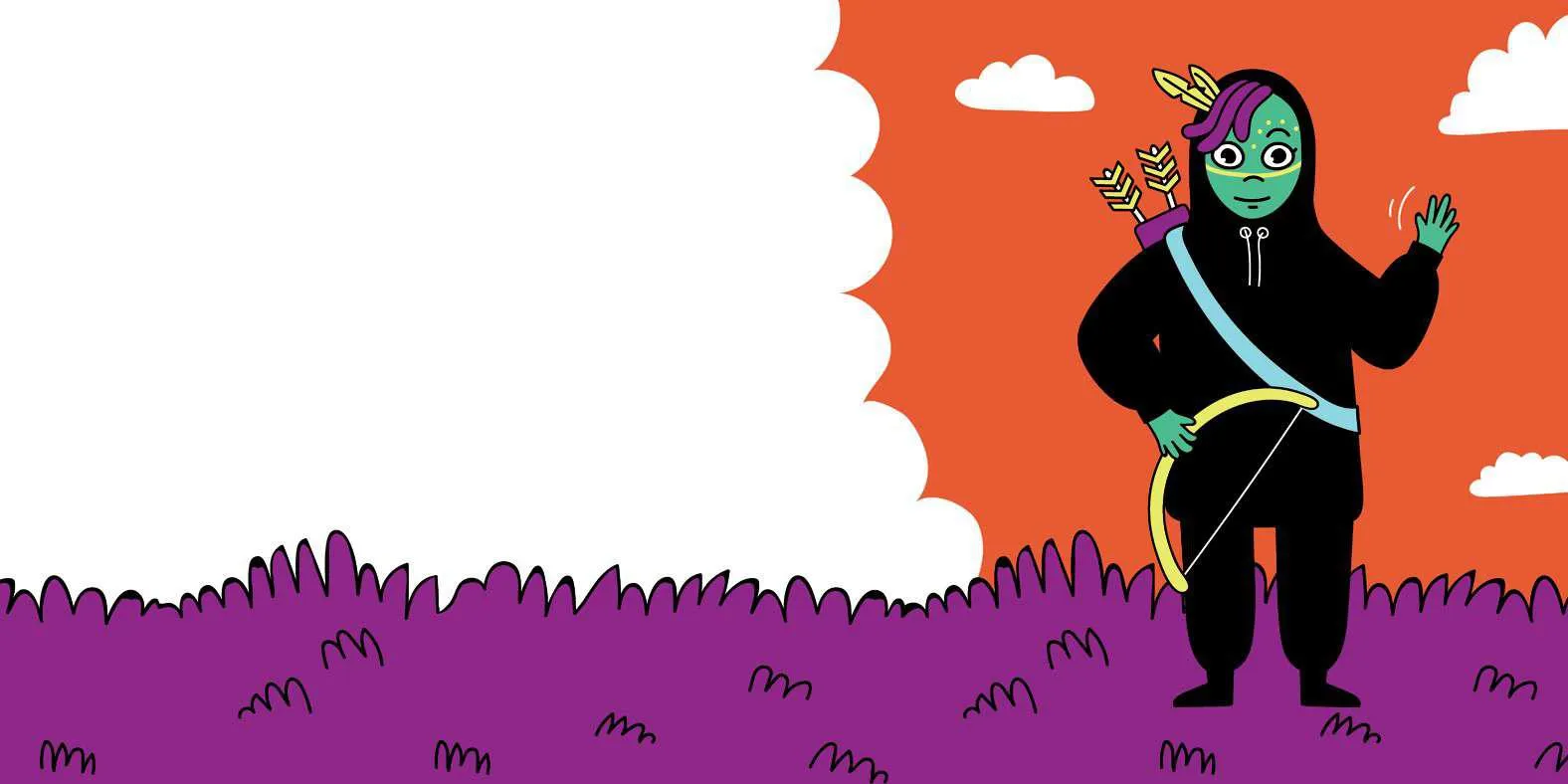 مَرْحَبًا! أَنَا مُحَارِبٌ، وأَنَا أُقَاتِلُ وَحْشًا، وأُريدُ مِنْكَ أَنْ تُساعِدَنِي. أَجَلْ، أَنْتَ! إِتْبَعْنِي.