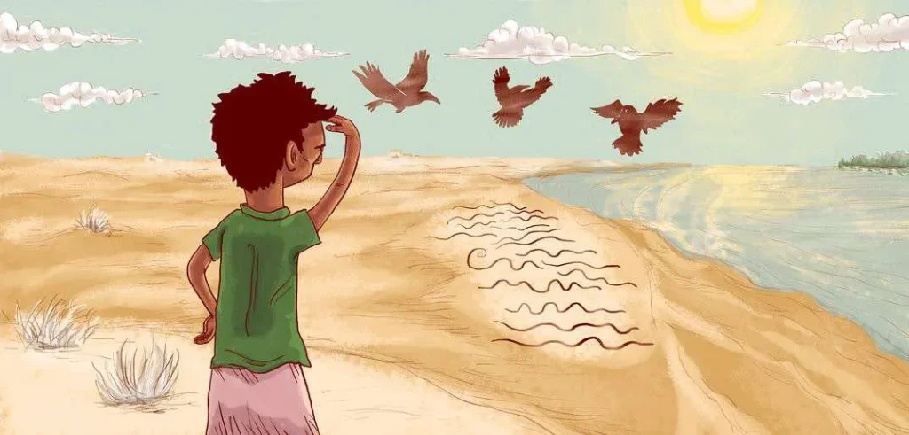 لاحظَ أنس أن الرمالَ تظهرُ من حولهِ في شكلِ خطوط، فتعجبَ لها قائلًا: يالها من رمال غريبة حقا! وهنا قررَ جاداف أن يقتربَ منها ليراها بوضوحٍ أكبر، فكانت المفاجأة.