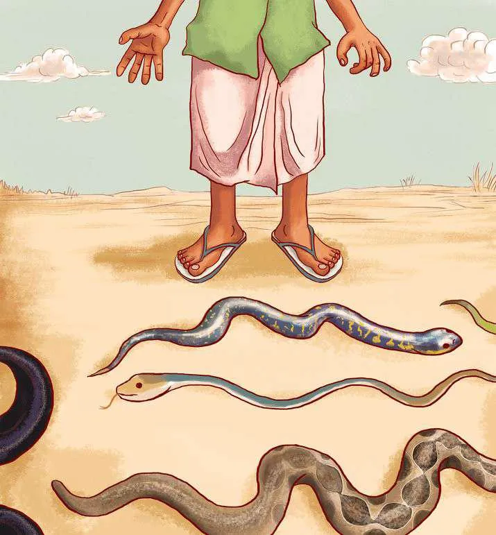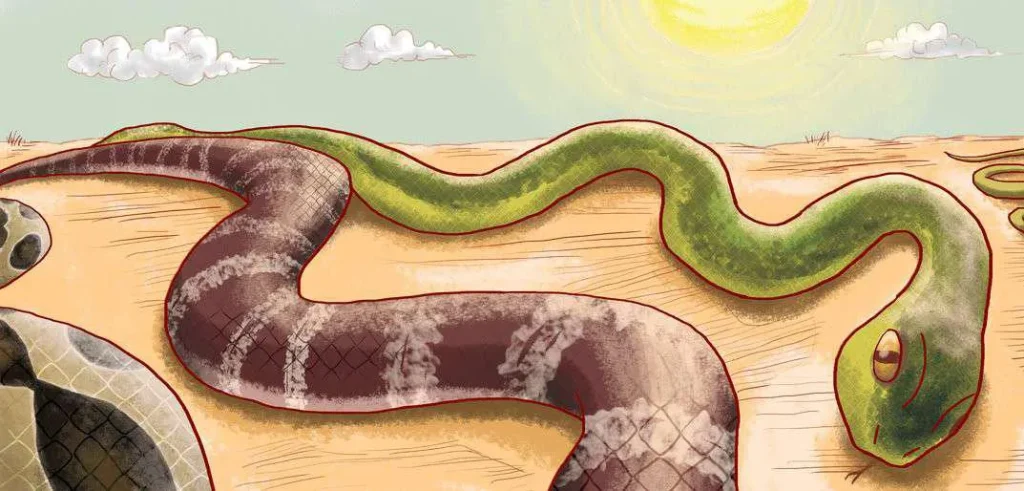 ثم لاحظَ أنس أن الثعابينَ ظلت مستلقيةً على الأرضِ دونَ حراك، فلم يقتربْ منه ثعبانٌ ليلدغهُ مثلا، ولم تتمايلْ الثعابينُ وتهسهسُ كعادتها، فتعجبَ لأمرها، إلا أنه سرعانَ ما أدركَ الأمر، فهذه الثعابين قد أرهقتها حرارةَ الشمسِ الشديدة ويبدو أنها تموت الآن.