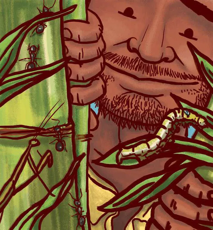 ولكن هذه المرة كان برفقتهِ بعضُ الأصدقاءِ الجدد الذين قدموا له يدَ العون، فهاهي أشجارُ البامبو قد اكتملَ نموها، فساعدت على تلطيف حرارة الجو، وها هي الحشراتُ الصغيرةُ تحرثُ الأرضَ بكلِ همةٍ ونشاط.