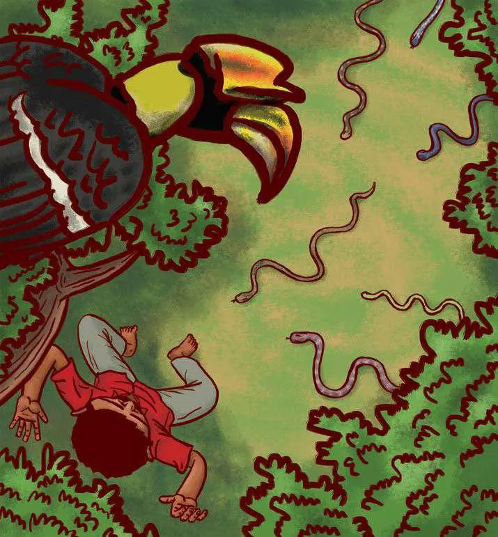 وقفَ أنس حائرًا عند رؤيةِ هذا المنظر، ثم قالَ لنفسه: لابد أن فيضانَ النهرِ بالأمسِ هو من أتى بالثعابينِ إلى هنا.