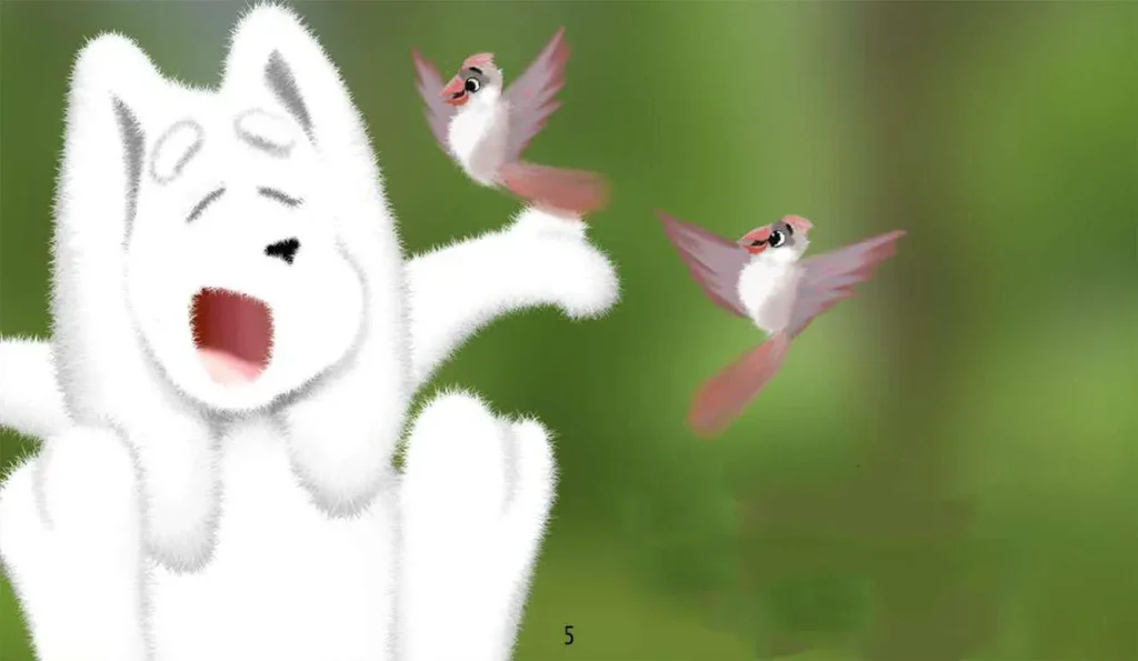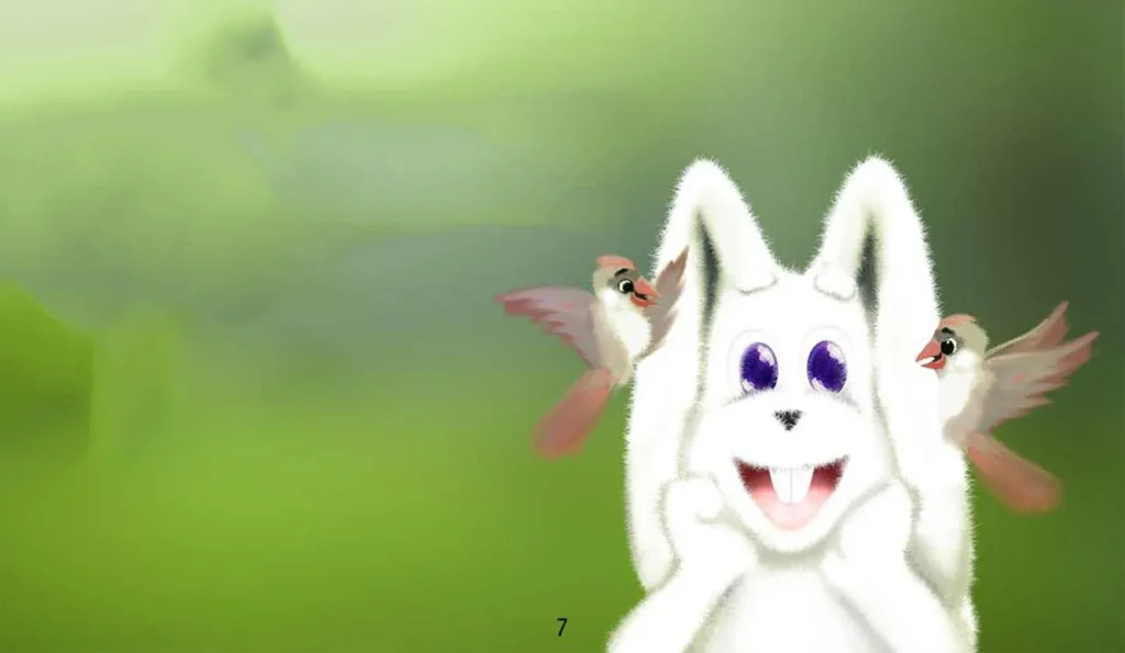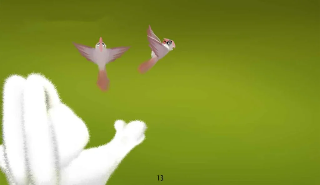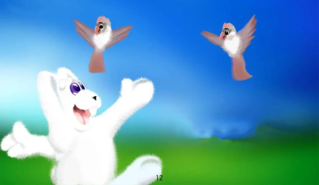 فِي أَحَدِ الأَيَّامِ زَارَتْ العَصَافِيرُ الْأَرْنَبَةَ وَرَأَوْا الزَّهْرَةَ الْجَمِيلَةَ: «أَهْلًا أَيَّتُهَا الأَرْنَبَةُ يَا لَهَا مِنْ زَهْرَةٍ جَمِيلَةٍ الَّتِي تَمْتَلِكِينَهَا هُنَاكَ.»