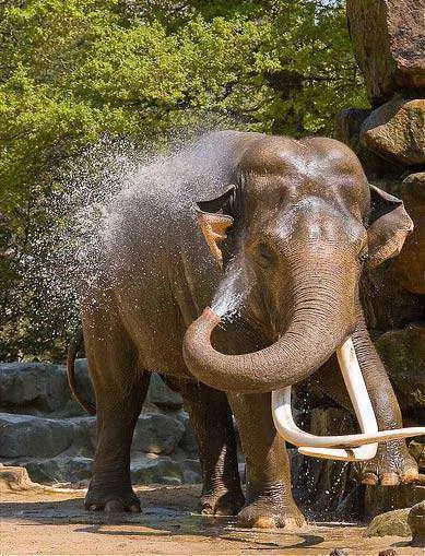 لَدَى الْفِيَلَةِ خَرَاطِيمٌ طَوِيلَةٌ، تَسْتَخْدِمُ الفِيَلَةُ خَرَاطِيمَهَا لِرَشِّ الْمَاءِ فِي أَفْوَاهِهَا وَالْتِقَاطِ الطَّعَامِ. بِوِسْعِهَا أَيْضًا أَنْ تُعْطِيَ أَنْفُسَهَا حَمَّامًا بِوَاسِطَةِ الْمَاءِ الَّذِي تَسْحَبُهُ بِخُرْطُومِهَا.