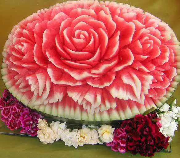 تُسْتَخْدَمُ الْفَوَاْكِهُ فِيْ بَعْضِ الْأَحْيَاْنِ فِيْ الْأَعْمَاْلِ الْفَنِّيَّةِ، حَيْثُ تَحْتَوِيْ بَعْضُ اللَّوْحَاْتِ الْفَنّيَّةِ عَلَىْ رُسُومَاْتٍ لِلْفَوَاْكِهِ. حَتَّىْ أَنَّ بَعْضَ الْأَشخْاْصِ يَنْقُشُوْنَ عَلَيْهَاْ. هَذِهِ بَطِّيْخَةٌ مَحْفُوْرَةٌ عَلَىْ شَكْلِ زَهْرَةٍ.