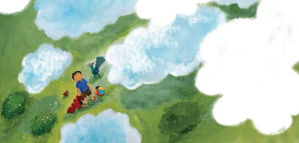 قَالَتْ الأُمُّ: لَا يَا عَزِيزِي. لَنْ تُمْطِرَ الْيَوْمَ، فَالْغُيُومُ الْبَيْضَاءُ الصَّغِيرَةُ عَالِيَةٌ جِدًّا فِي السَّمَاءِ.
