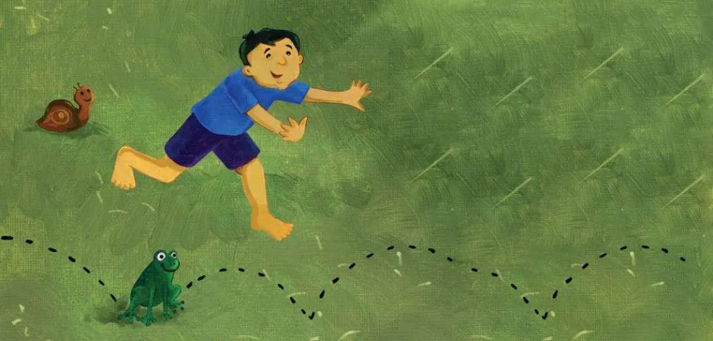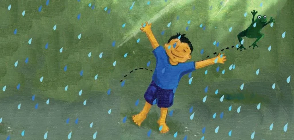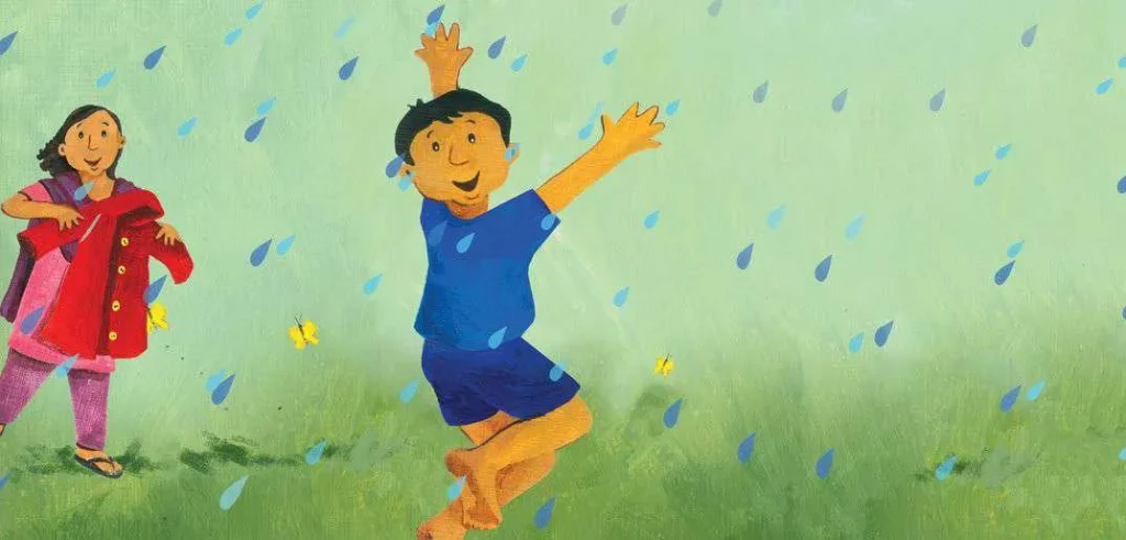 رَاحَ مَانُو يُغَنِّي وَهُوَ يَرْكُضُ خَارِجَ الْمَنْزِلِ: يَا سَلَامُ! هَا هِيَ تُمْطِرُ، هَا هِيَ تُمْطِرُ.