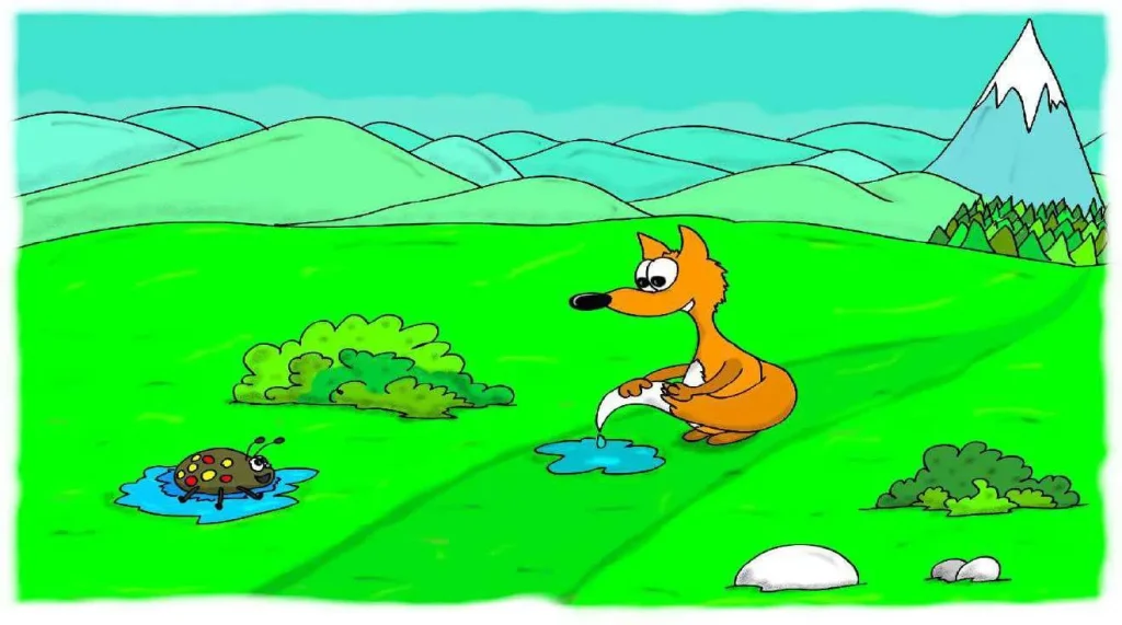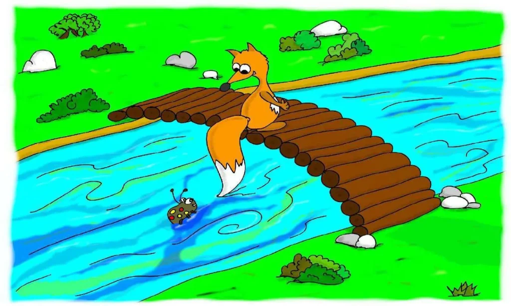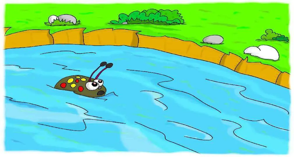 نَظَرَ بُوبُو حَوْلِهِ وَرَأَى خُنْفُسَاءَ وَاقِعَةً فِي النَّهْرِ. كَانَتْ ضِفَّةُ النَّهْرِ مُنْحَدِرَةً جِدًّا بِالنِّسْبَةِ لِلْخُنْفُسَاءِ الصَّغِيرَةِ. لَمْ تَسْتَطِعْ الْخُرُوجَ مِنَ النَّهْرِ! وَكَانَتْ تُلَوِّحُ أَرْجُلَهَا وَقُرُونَهَا فِي ذُعْرٍ.