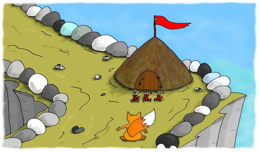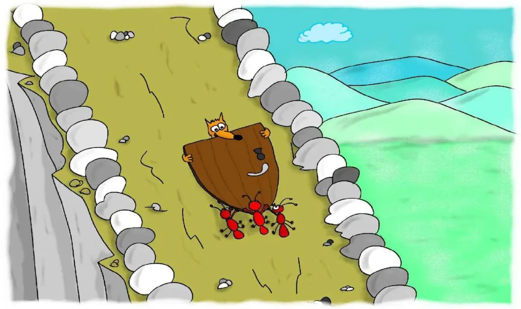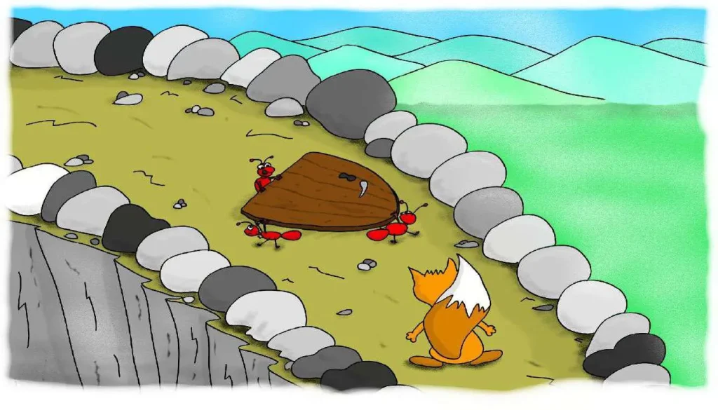 قَرَّرَ بُوبُو مُسَاعَدَتَهُنَّ بِالرَّغْمِ مَنْ أَنَّهُ كَانَ مُتَأَخِّرًا بِالْفِعْلِ عَنِ الْمُسَابَقَةِ. حَمَلَ الْبَابَ الثَّقِيلَ نَحْوَ أَعْلَى الْجَبَلِ بِمُسَاعَدَةِ النَّمْلَاتِ.