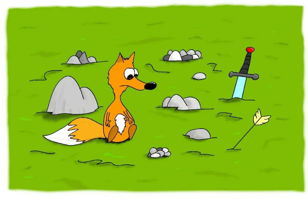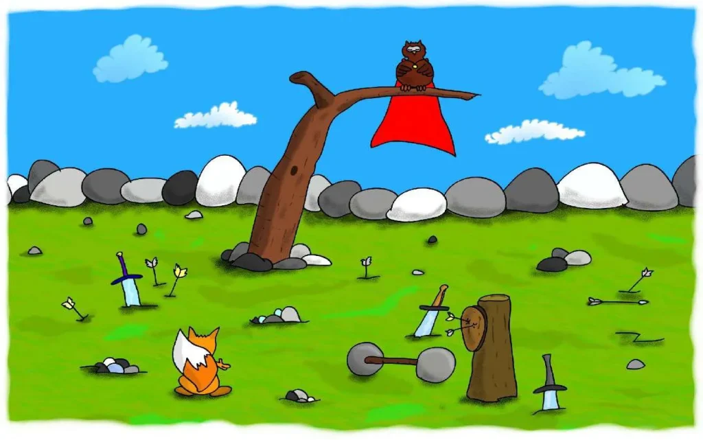 عِنْدَمَا وَصَلَ إِلَى الْقِمَّةِ أخِيرًا، كَانَتْ الْمُسَابَقَةُ قَدِ اِنْتَهَتْ. سِهَامٌ مَكْسُورَةٌ وَأَهْدَافٌ وَسُيُوفٌ. كَانَتْ كُلُّهَا مُلْقَاَةً فِي أَنْحَاءِ الْمَرْجِ. لَكِنْ، كُلُّ الْأَبْطَالِ قَدْ رَحَلُوا.