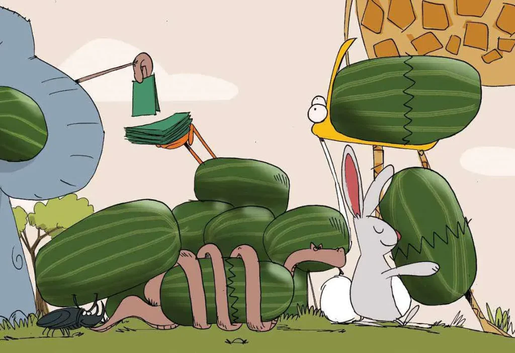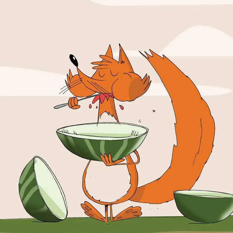 شَقَّ بِطِّيْخَةً كَبِيْرَةً وَفَتَحَهَا، تُمَ أخْرَجَ الْفَاكِهَةَ والْتَهَمَهَا.