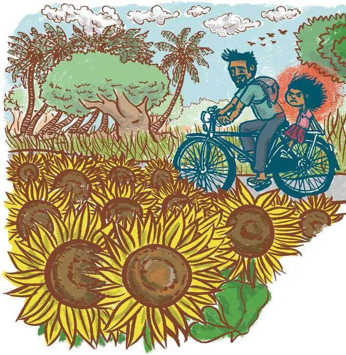 قَالَ بَابَا، بَيْنَمَا كَانُوا يَقُودُونَ الدَّراجَةَ عَبْرَ الْحَقْلِ: رَنَا! رَنَا! انْظُرِي إِلَى أَزْهَارِ دَوَّارِ الشَّمْسِ الْجَمِيلَةِ