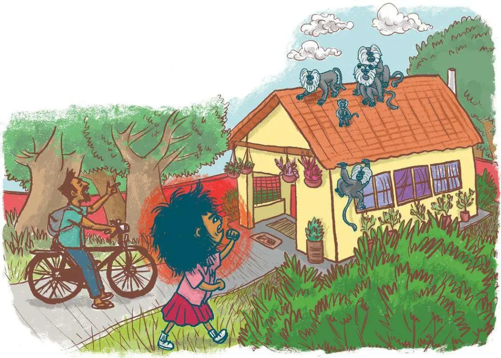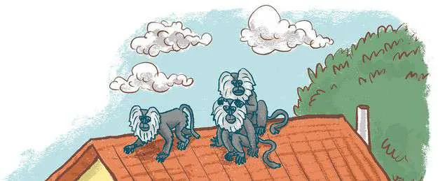قَالَ بَابَا، وَهُوَ يُشِيرُ إِلَى سَطْحِ مَنْزِلِهِمْ: رَنَا! رَنَا! انْظُرِي إِلَى الْقُرُودِ.