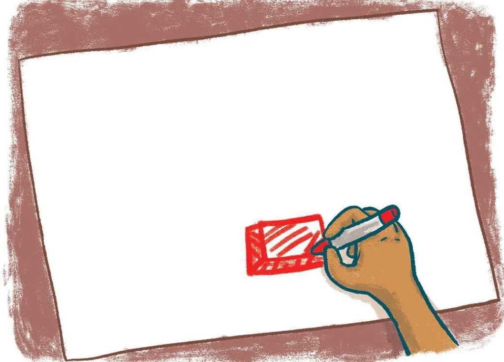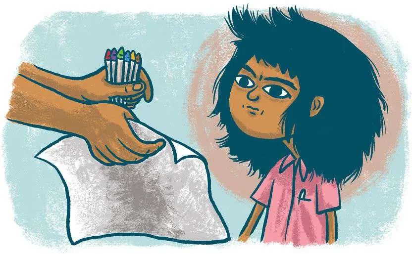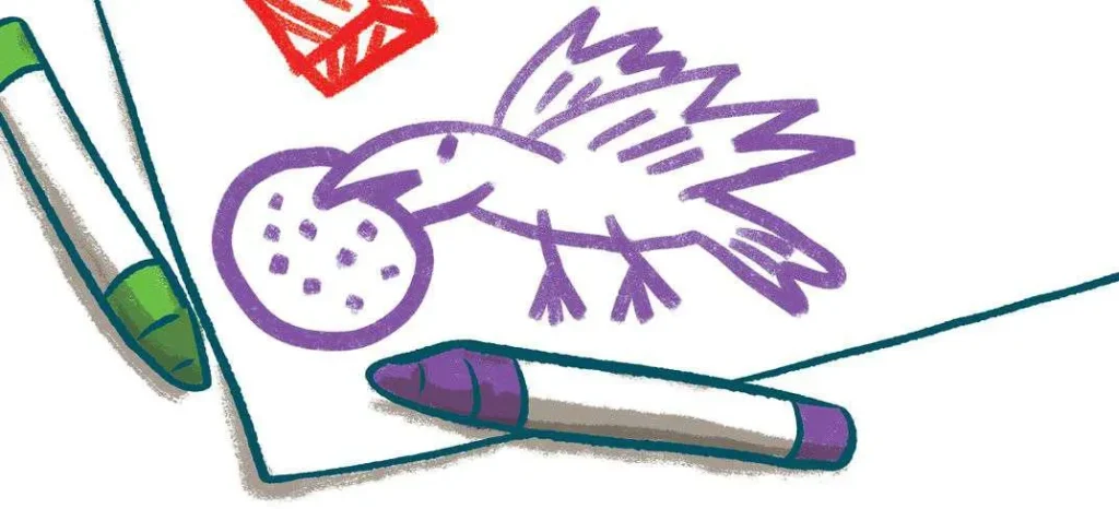 سَأَلَ بَابَا: هَلْ تُحِبِّينَ أَنْ تَرْسُمِيهِ؟ إِلَيْكِ بِقِطْعَةٍ مِنَ الْوَرَقِ وَبَعْضِ الْأَقْلَامِ الْمُلَوَّنَةِ.