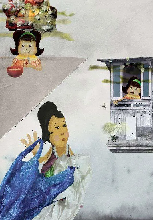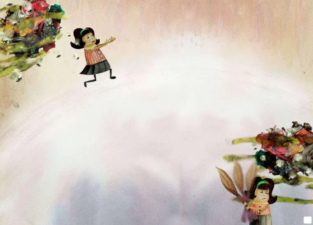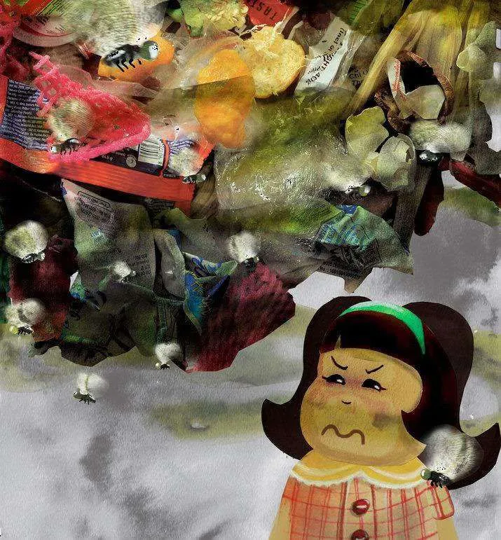 ذَاْتَ يَوْمٍ، أَصْبَحَتْ الْعَمَّةُ غَاْضِبَةً جِدًّا وَقَاْلَتْ لِجَنَىْ: قَرِيْبًا سَتَقُوْمُ كُلُّ هَذِهِ النُّفَاْيَاْتِ بِمُلَاْحَقَتِكِ! وَلَكِنَّ جَنَىْ ضَحِكَتْ. وَفِيْ الصَّبَاْحِ التَّاْلِيْ، اسْتَيْقَظَتْ جَنَىْ عَلَىْ رَاْئِحَةٍ كَرِيْهَةٍ وَصَوْتِ ذُبَاْبٍ مُزْعِجٍ. لَقَدْ كَاْنَتْ سَحَابَةُ النُّفَاْيَاْتِ تَطُوْفُ فَوْقَ رَأْسِهَاْ. كَلِمَاْتُ الْعَمَّةِ أَصْبَحَتْ حَقِيْقَةً. حِيْنَئِذٍ، لَمْ تَسْتَطِعْ جَنَىْ أَنْ تَضْحَكَ.
