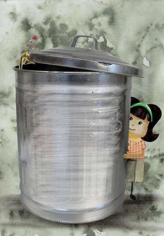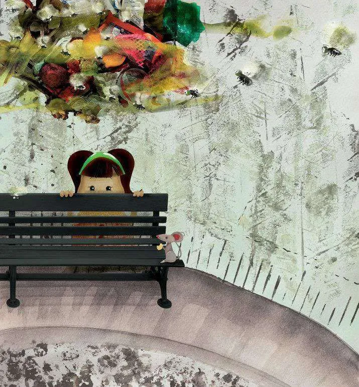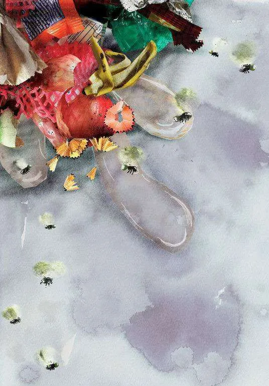 قِشْرُ بُرْتُقَاْلٍ وَعُلَبُ بَسْكَوِيْتٍ، أَلْعَاْبٌ مُحَطَّمَةٌ وَنِجَارَةُ أَقْلَاْمِ رَصَاْصٍ، وَزُجَاْجَاْتٌ بِلَاْسْتِيْكِيَّةٌ فَاْرِغَةٌ، وَحَوْلَ كُلِّ ذَلِكَ سِرْبٌ مِنَ الذُّبَاْبِ الصَّاْخِبِ.