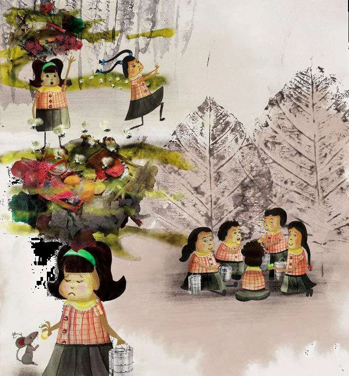 سَأَلَتْ جَنَىْ صَدِيْقَتَهَاْ رَنَاْ: هَلْ يُمْكِنُنِيْ اسْتِعَاْرَةُ الْمِبْرَاةِ؟ نَظَرَتْ لَهَاْ رَنَاْ نَظْرَةَ اشْمِئْزَاْزٍ وَذَهَبَتْ لِتَجلِسَ بَعِيْدًا عَنْهَاْ. جَلَسَتْ جَنَىْ تَأكُلُ طَعَاْمَهَا وَحِيدَةً. أَدْرَكَتْ جَنَىْ أَنَّهُ كَاْنَ عَلَيْهَاْ أَنْ تَسْتَمِعَ إِلَىْ كَلَاْمِ الْعَمَّةِ سَمِيْرَةٍ. كَاْنَتْ عَمَّتُهَاْ دَاْئِمًا مَاْ تُخْبِرُهَاْ أَلّاْ تُلْقَيَ النُّفَاْيَاْتِ عَلَىْ الْأَرْضِ.
