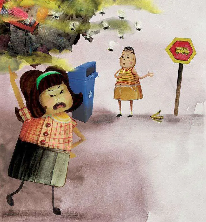 وَلَكِنْ، عِنْدَمَاْ تَرْمُونَ النُّفَاْيَاْتِ فِيْ الشَّاْرِعِ فَإِنَّهَاْ تَتَجَمَّعُ عَلَىْ جَاْنِبَيْ الطَّرِيْقِ. بَعْضُهَاْ يَذْهَبُ إِلَىْ الْمَصَاْرِفِ التِّيْ تَحْمِلُ الْمَجَاْرِيْ مِنْ مَنَازِلِكُمْ، وَهَذِهِ النُّفَاْيَاْتُ تَسُدُّ الْمَصَاْرِفَ وَتَجْلِبُ الْحَشَرَاْتِ الَّتِيْ تَنْقُلُ الْأَمْرَاْضَ السَّيِّئَةَ! لَاْ أَحَدَ يُحِبُّ أَنْ يَعِيْشَ فِيْ بِيْئَةٍ مُلَوَّثَةٍ. اسْأَلُوا جَنَىْ.