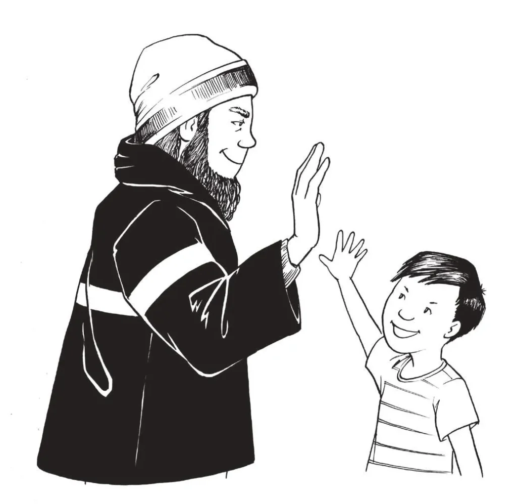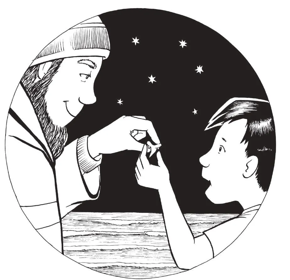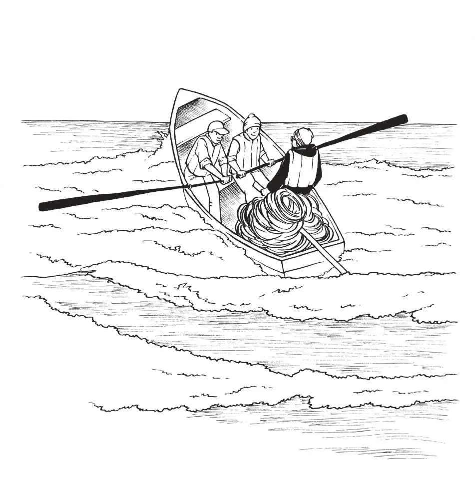 يَشُدُّ الرِّجَالُ الْقَارِبَ وَيلِفُّونَ الحِبَالَ. يَعْلَقُ مُثَلَّثْ أَبْيَضُ صَلْبٌ بِإِصْبَعِ الْأَبِ.