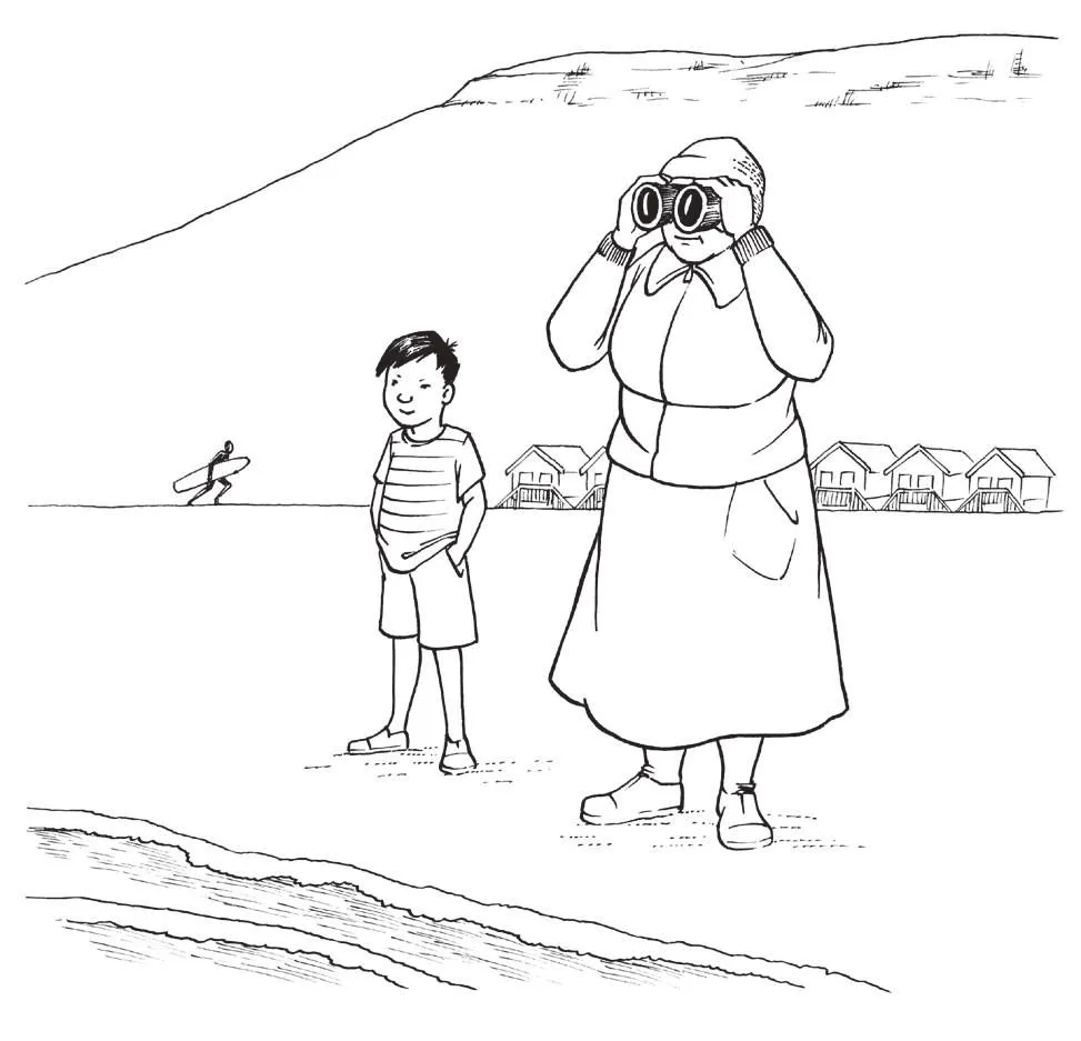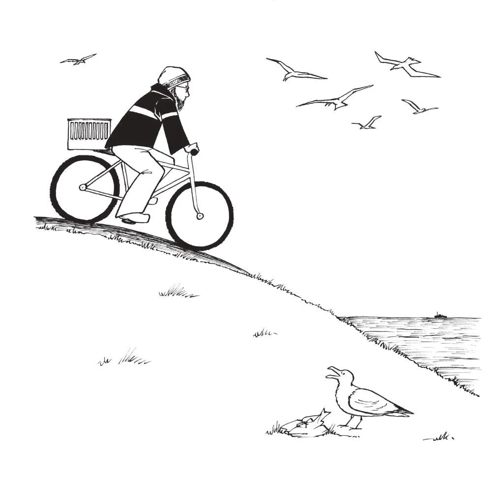 سَمَكَةٌ وَهَلِيَّةٌ! يَا تُرى مَا هِيَ؟ يَقُودُ الأَبُ الدَّرَّاجَةَ مُتَجِهًا إِلَى شَاطِئئ ميوزنج بيرج، وَتُخْدِثُ الْعَجَلَاتُ صرِيرًا طوَالَ الطَرِيقِ إِلَى مَنْطِقَةِ رَاكِبِي الأمْوَاجِ. تُطَوّقُ طُيورُ النَّوْرَسِ السَّمَاءَ، وتَصِيحُ الطَّيورُ: مَاذَا؟ مَاذَا؟