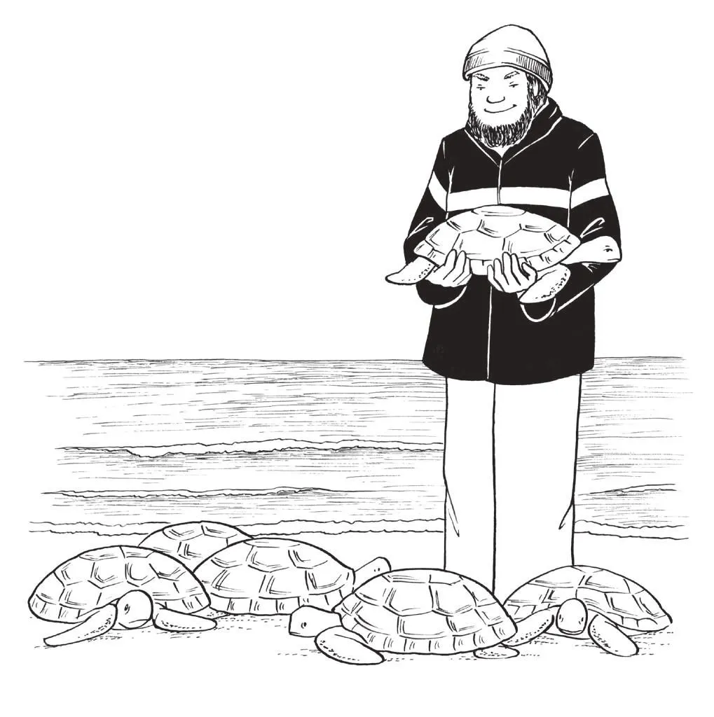 وَفِي بَعْضِ الْأَحْيَانِ يُحْضِرُ وَالِدُ يُوسُفَ قِصَّةً، مِثْلَ تِلْكَ الْمَرَّةِ الَتِي وَجَدُوا فيهَا السَّلَاحِفَ الْبَحِرِيَّةَ عَلَى الرّمْلِ، المِئاتُ جَرَفَتْهُا الْأَمْوَاجُ فِي عَاصِفَةٍ.