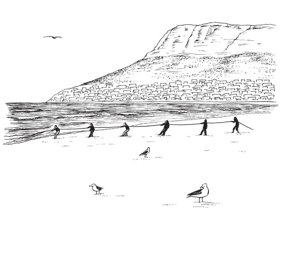 تَسْمَعُ أَصْوَاتَ صَفَّارَاتِ التَّحْذِيرِ مِنْ سَمَكِ الْقِرْشِ. السَّبَّاحُونَ يَرْكُضُونَ عَائدِينَ نَحْوَ الشَّاطِيء، وَيَتَّنَاوَلُونَ مَنَاشِفَهُمْ بِسُرْعَةٍ. يَنْدَفِعَ رَاكِبُو الْأمَوَاجِ إِلَى الشَّاطِيِء حَامِلِينَ ألْواحَهُمْ تَحْتَ أَذْرُ عِهِمْ، ثُمَ يَخْلَعُون سُتْرَاتِهِمِ الْمَبْلُولَةَ وَقْتَ الاسْتِحْمَام. تَصِيحُ طُيُورُ النَّوْرَسِ: مَاذَا؟ مَاذَا؟ مَاذَا سَيُحْضِرُ وَالِدُ يُوسُفَ مِنَ الْمُحِيطِ؟