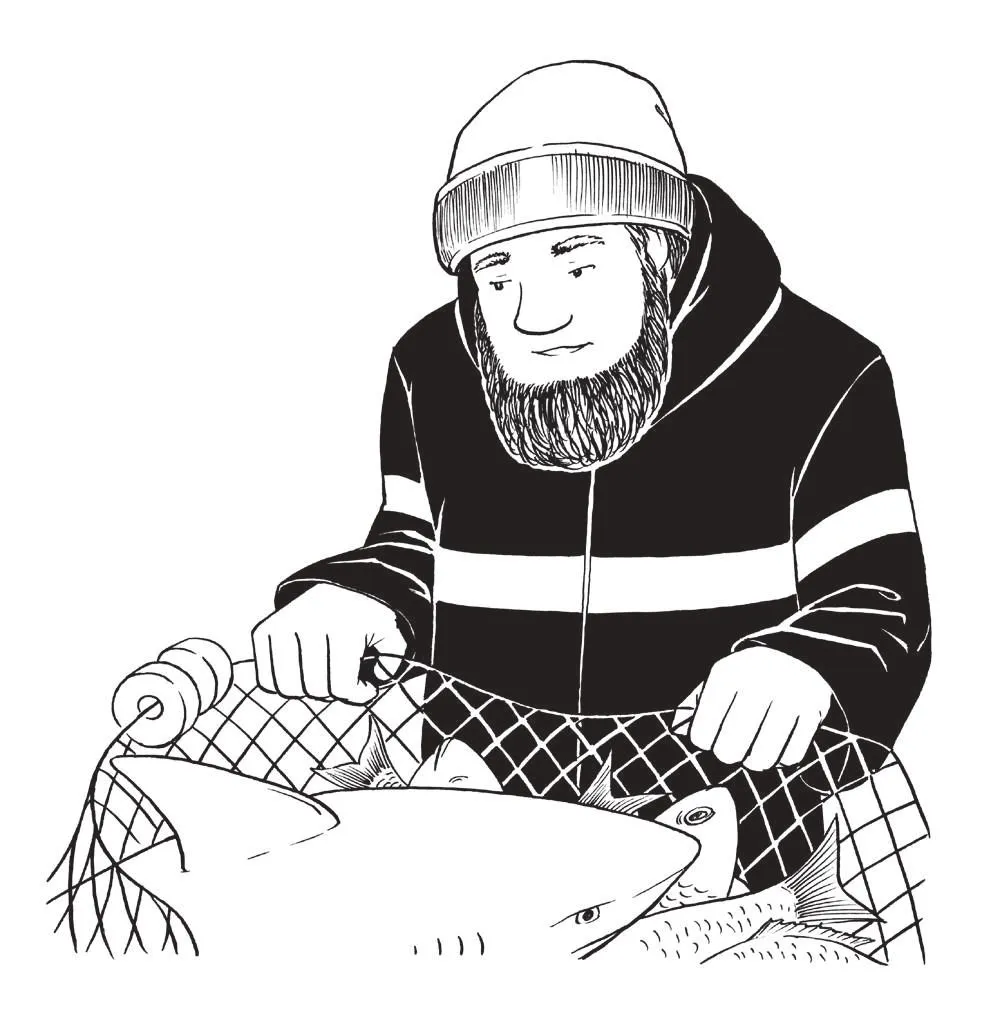 أَخَذَ الْقِرْشُ يَتَقَلَّبُ وَيَضْرِبُ فِي الْأَمْواج. فَكَ وَالِدُ يُوسُفَ الشِّبَاكَ وَهُوَ يُغَنِّي لِلْقِرْشٍ: ألْق بِخِفَّةٍ، تَصْطَدْ سَمَكَةً. اسْحَبْ وَارْم، هَيَا أقْدِمْ!