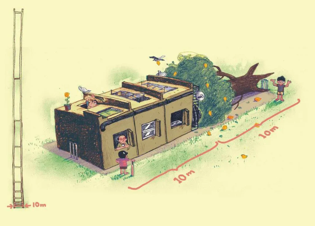 الآنَ، وبَعْدَ أَنْ أَدْرَكْتُمْ حَجْمَ الْمِتْرِ الْوَاحِدِ، سَنَتَسَلَّقُ الْخَطْوَةَ التَّالِيةَ مِنْ سُلَّمِنَا عَلَى بُعْدِ عَشْرَةٍ أَمْتَارٍ. يَبْلُغُ طُولُ مَبْنَى مُكَوَّنٍ مِنْ ثَلَاثَةِ طَوَابِقَ أَوْ طُولُ شَجَرَةٍ مَانْجُو عَشْرَةَ أَمْتَارٍ تَقْرِيبًا، أَمَّا طُولُ مَلْعَبِ الْكِرِيكِت فَيَبْلُغُ ضِعْفَ هَذَا تَقْرِيبًا.