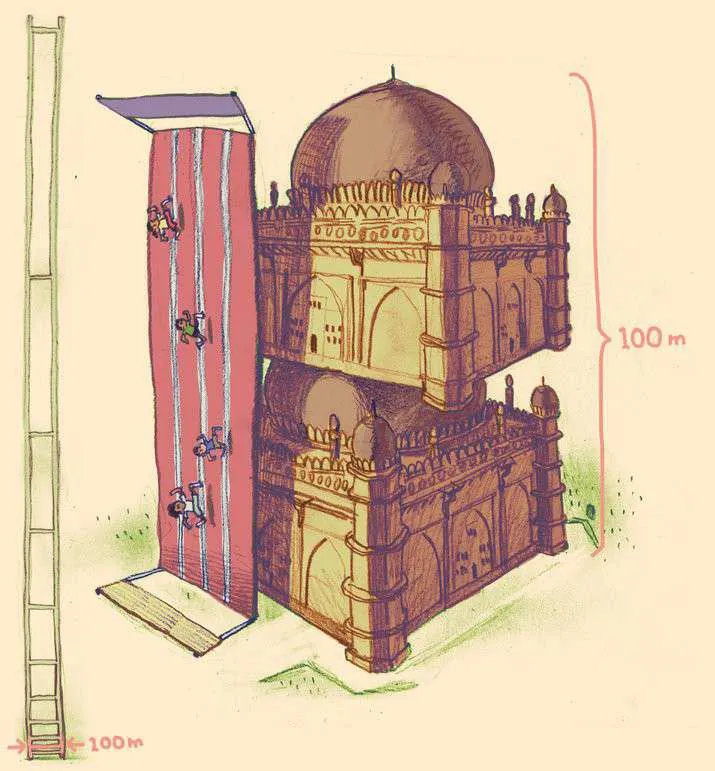 تَخَيَّلُوا الْآنَ أَنَّ مَسَارَ ال 100م تَوَجَّهَ لِلأَعْلَى! سَيَبْلُغُ طُولُهُ، تَقْرِيبًا، ضِعْفَ اِرْتِفَاعِ مَقْبَرَةٍ مُحَمَّد عَادِل شَاه.