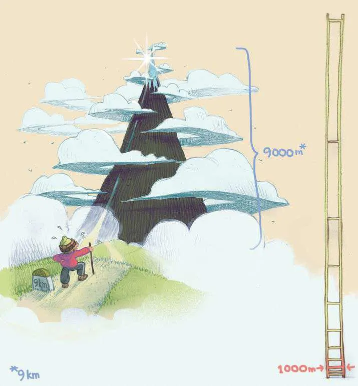 مِتْرٍ عَشْرَ مَرَّاتٍ، سَتَقْطَعُونَ تِلْكَ الْمَسَافَةَ. أُفِّ! سَتَتَسَلَّقُونَ مَسَافَةَ ٩ كم تَقْرِيبًا لِتَصِلُوا إِلَى قِمَّةِ جَبَلِ إيفرست.