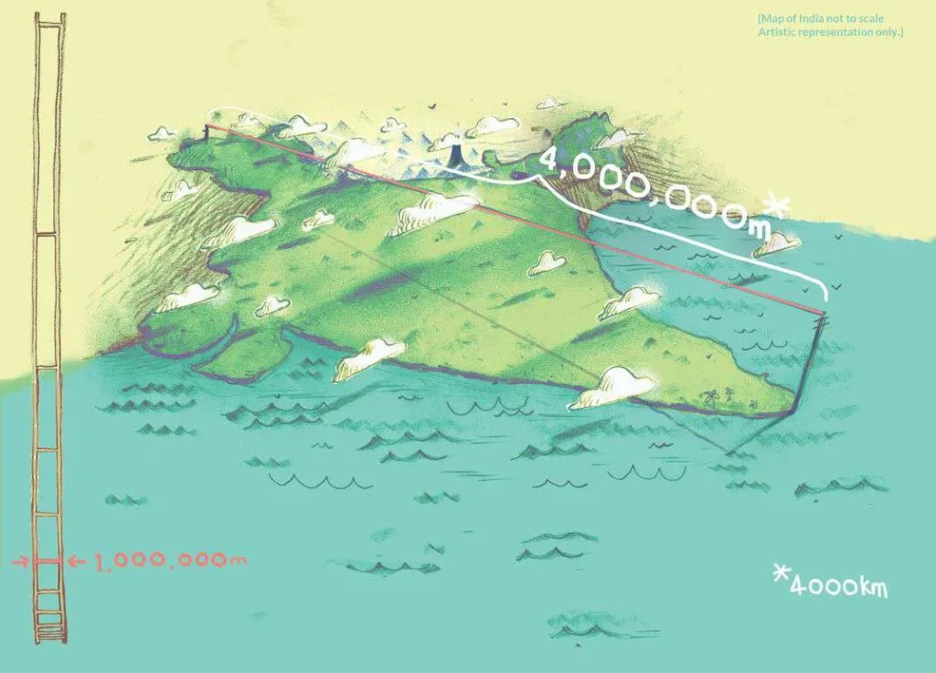 إِنَّ الْمَسَافَةَ مِنَ الطَّرَفِ الشَّمَالِيِّ لِلهندِ فِي كشمير إِلَى الطَّرَفِ الْجَنُوبِيِّ فِي كانياكوماري تُسَاوِي تَقْرِيبًا أَربَعَةَ أَضْعَافِ هَذِهِ المَسَافَةِ (4 مَضْرُوبَةً فِي 1,000,000)؛ أيْ 4,000,000م .