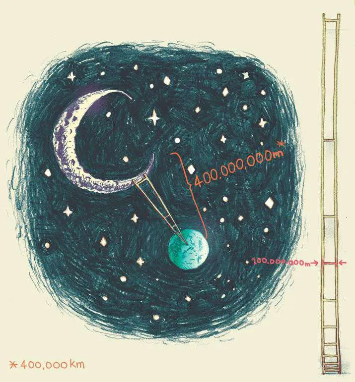 الْخُطْوَةُ الثَّامِنَةُ: 100,000,000 متر كَمْ تَبْعُدُ الْمَسَافَةُ إِلَى الْقَمَرِ اللَّامِعِ الْجَمِيلِ؟