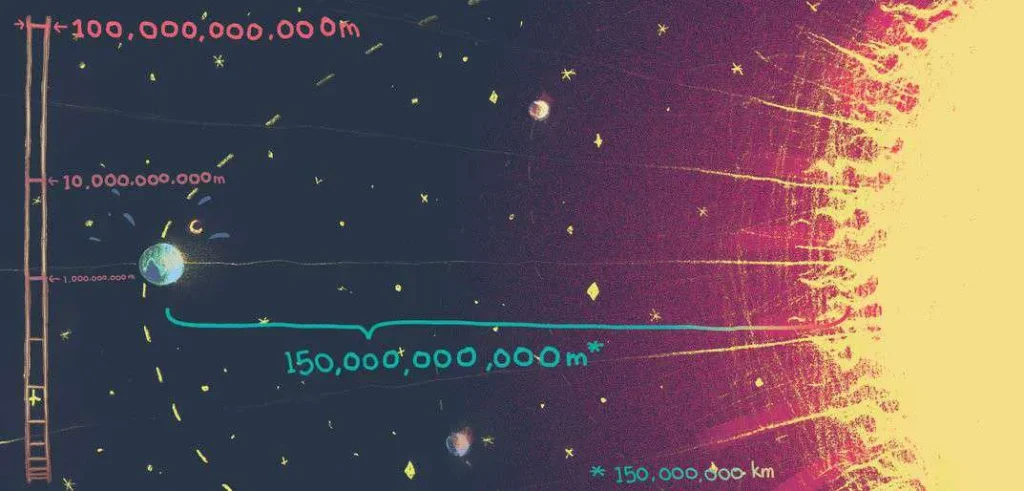إِنَّهَا بَعِيدَةٌ جِدًّا جِدًّا! وَلَكِنْ، مَازَالَتِ الشَّمْسُ الْبَعِيدَةُ جِدَّا تُضِيءُ الْأَرْضَ لَنَا، وَتَجْعَلُنَا نَتَعَرَقُ فِي فَصْلِ الصَّيْفِ. أَلَيْسَ ذَلِكَ أَمْرًا مُذْهِلَ؟